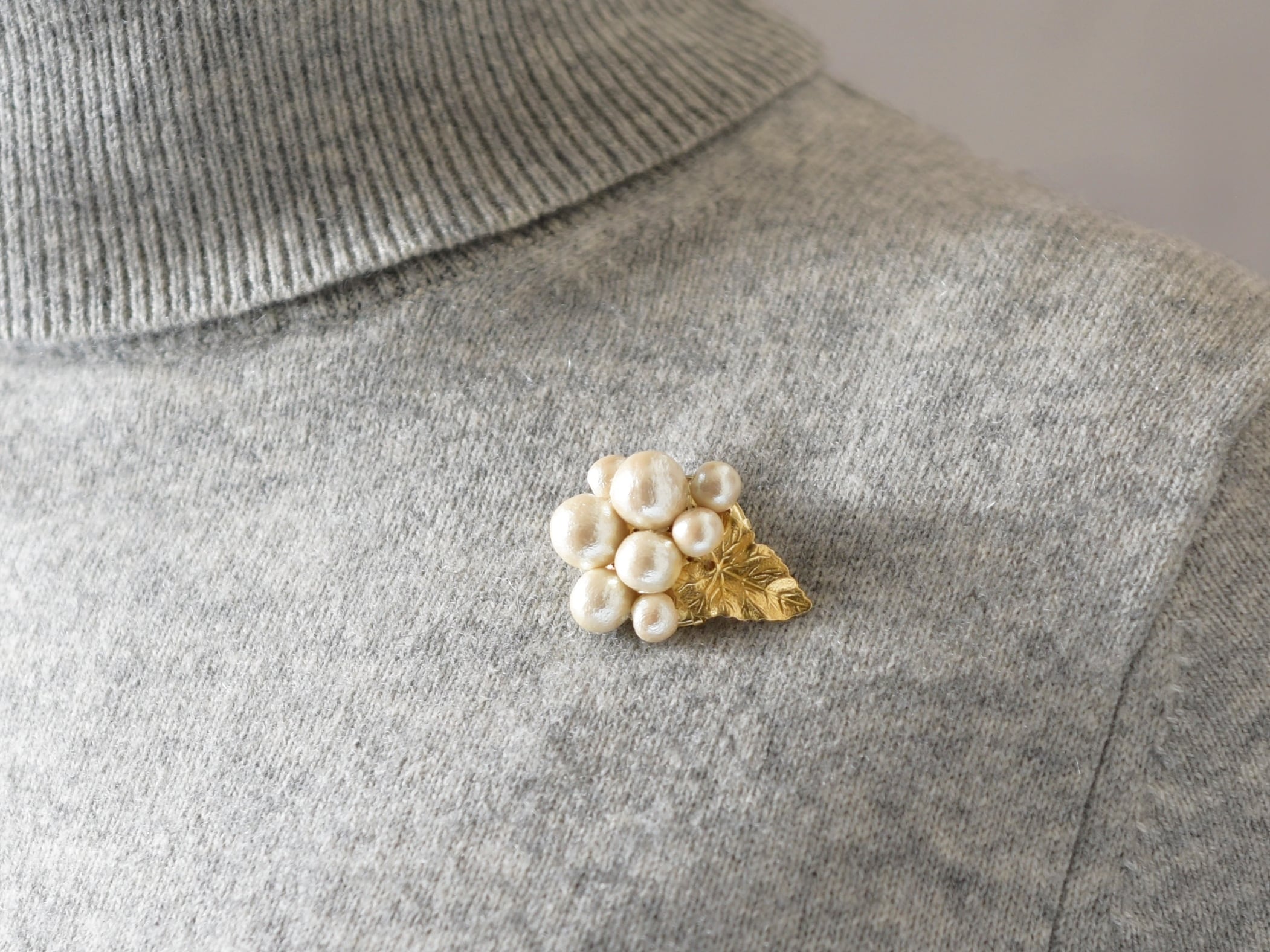 【ブローチ】コットンパールの花/ヴィンテージな真鍮の葉っぱ付(セットに変更可能)