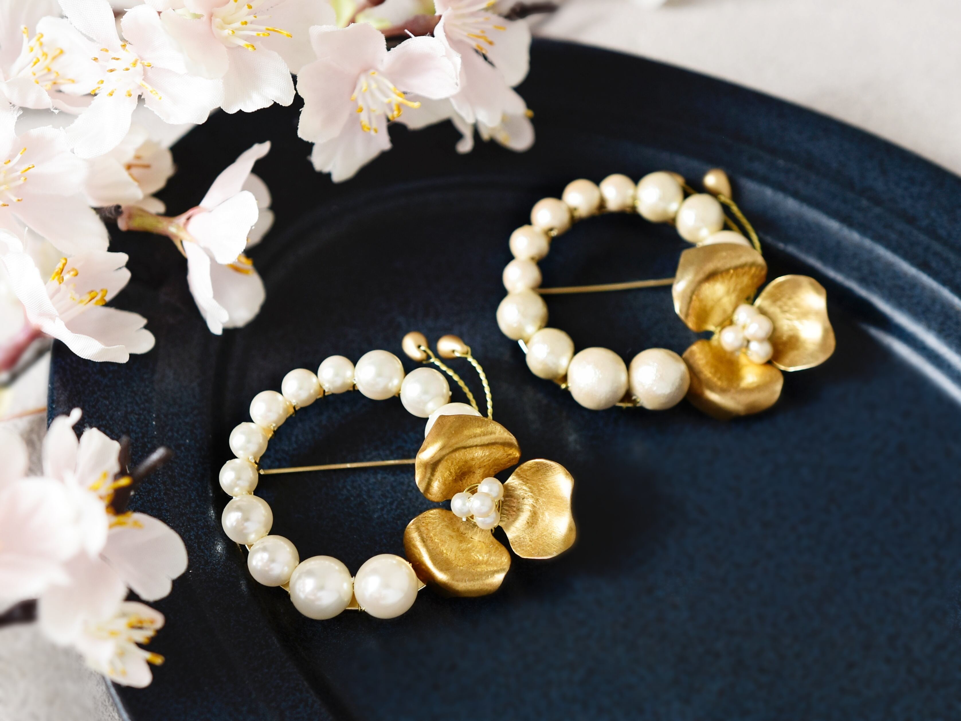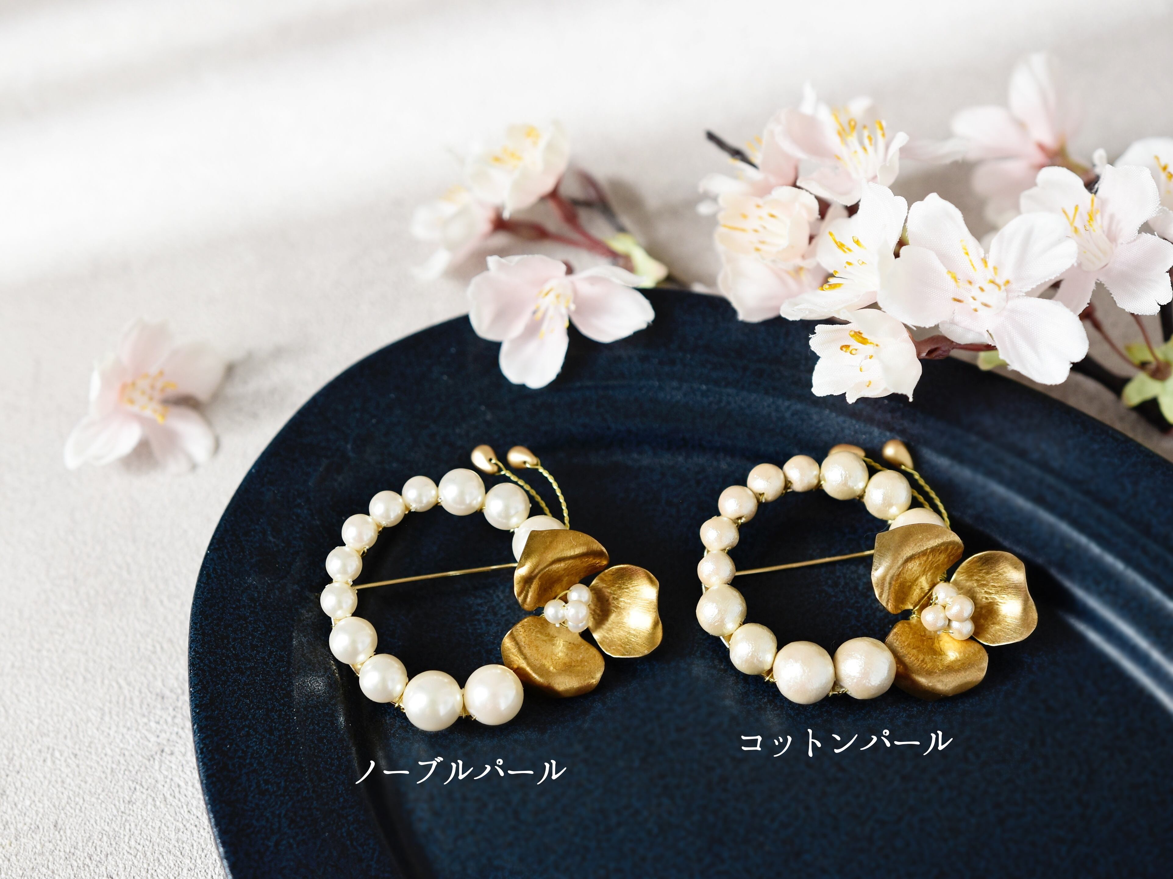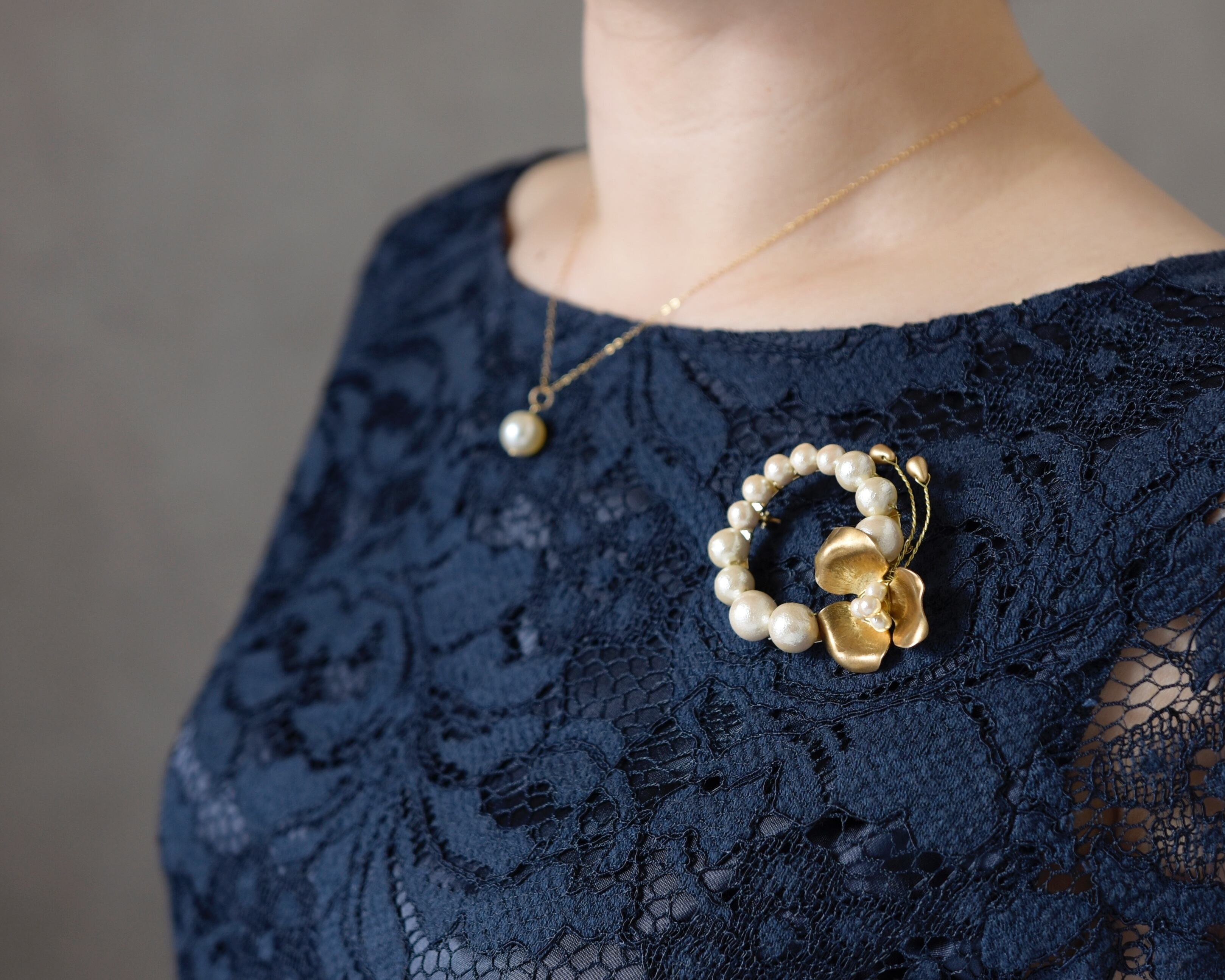 【ブローチ】選べるパール/真鍮の花のリース(卒園式、卒業式、入園式、入学式など)