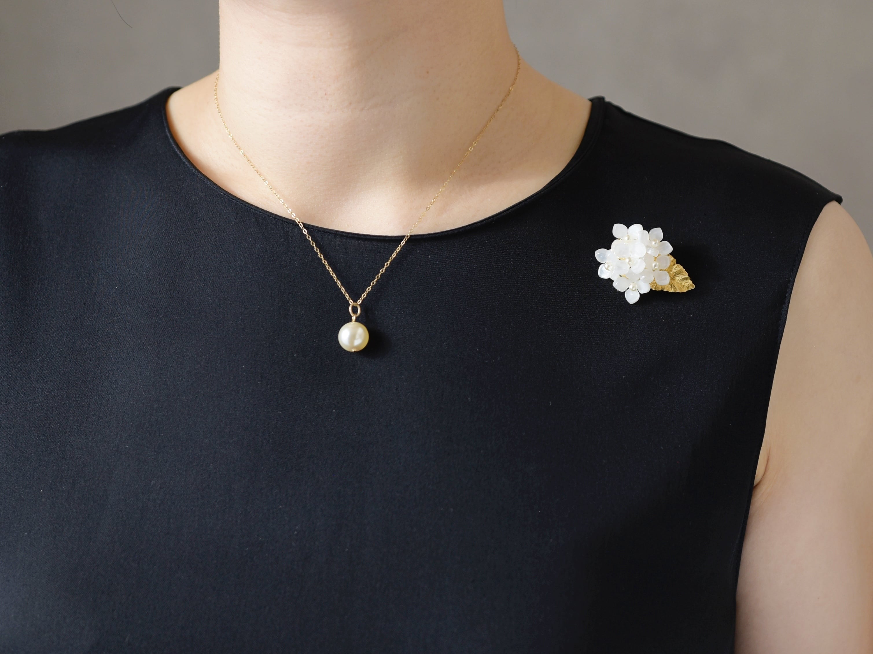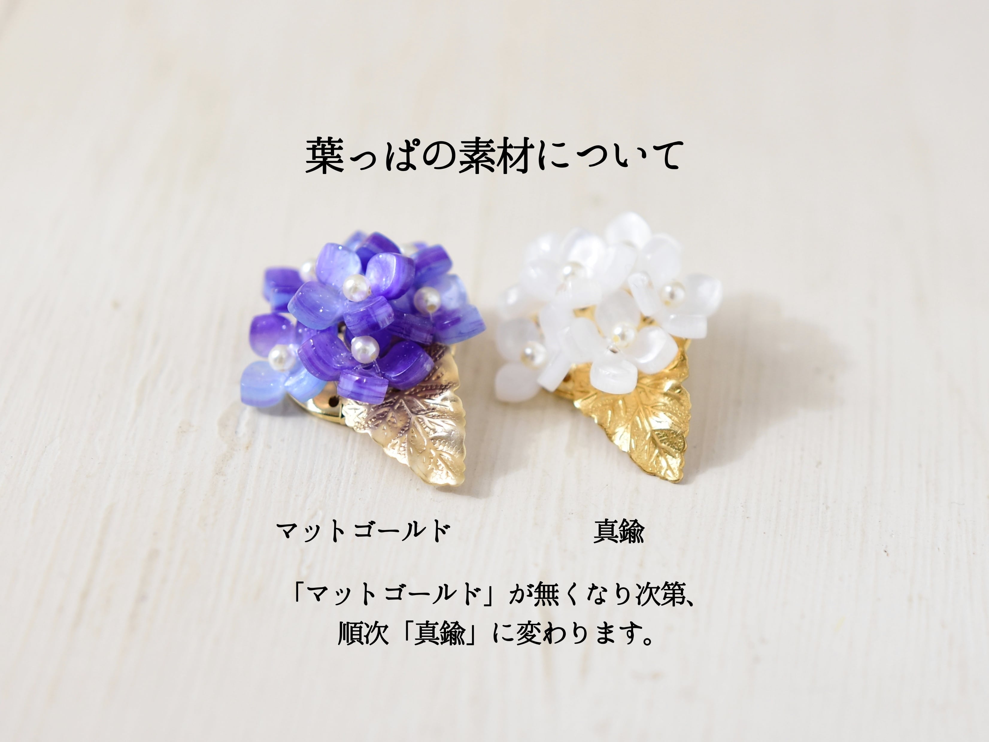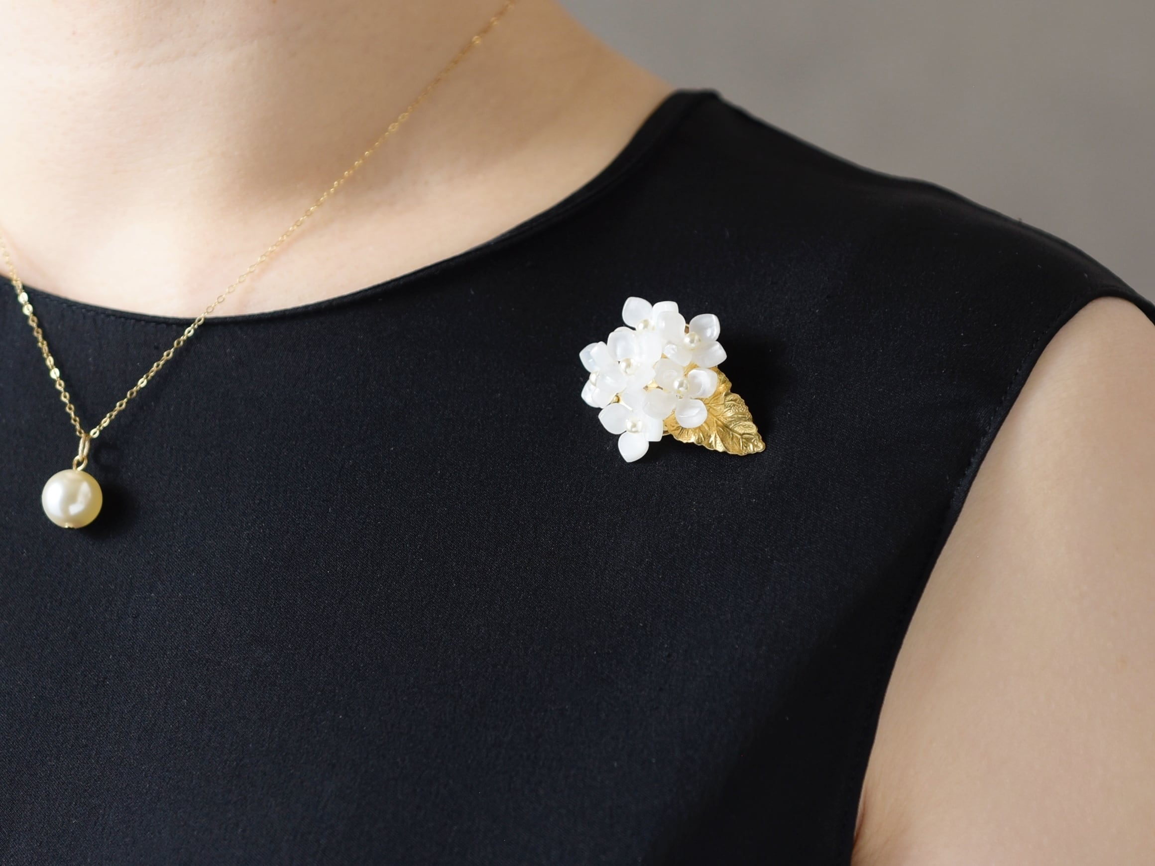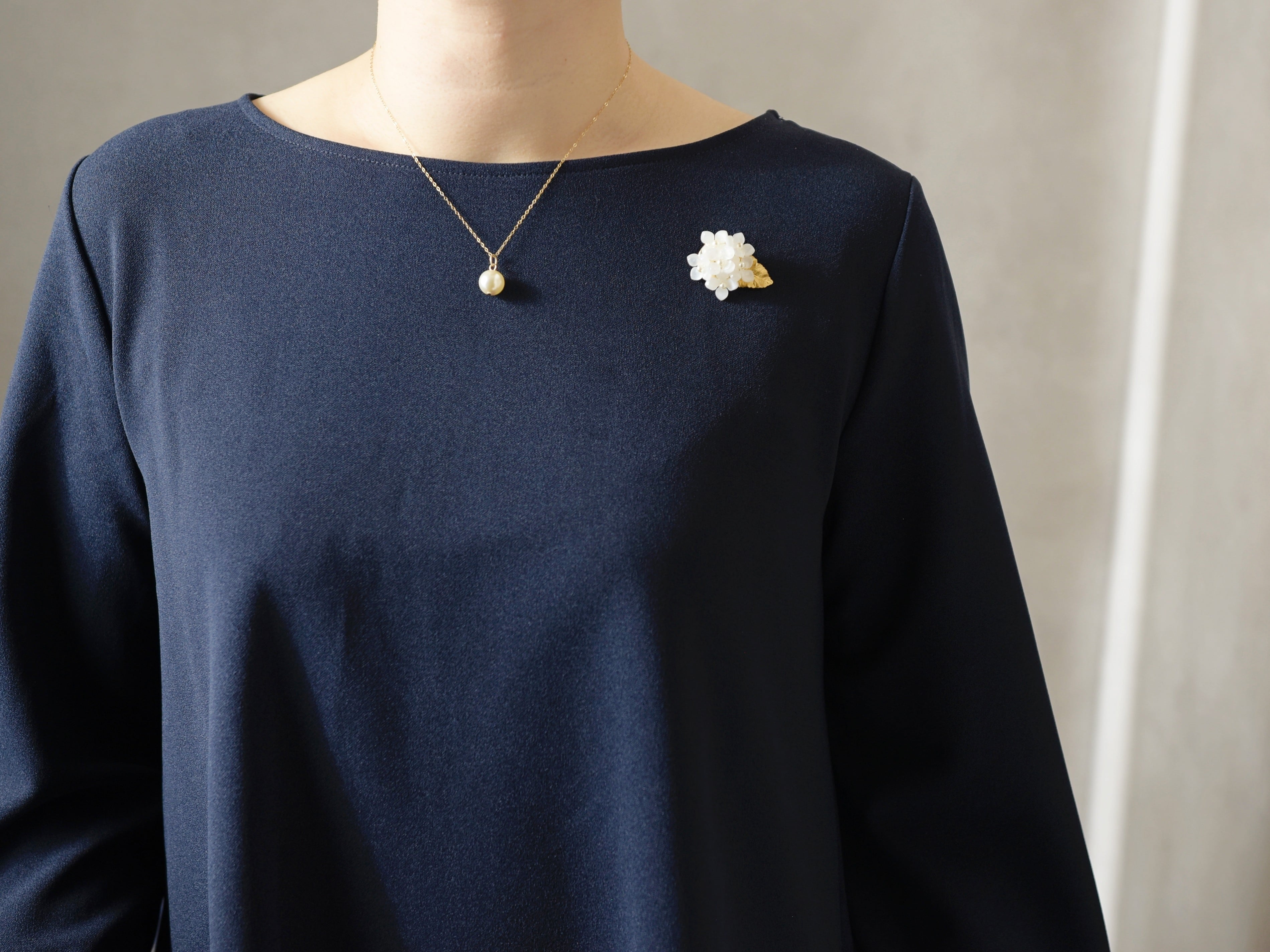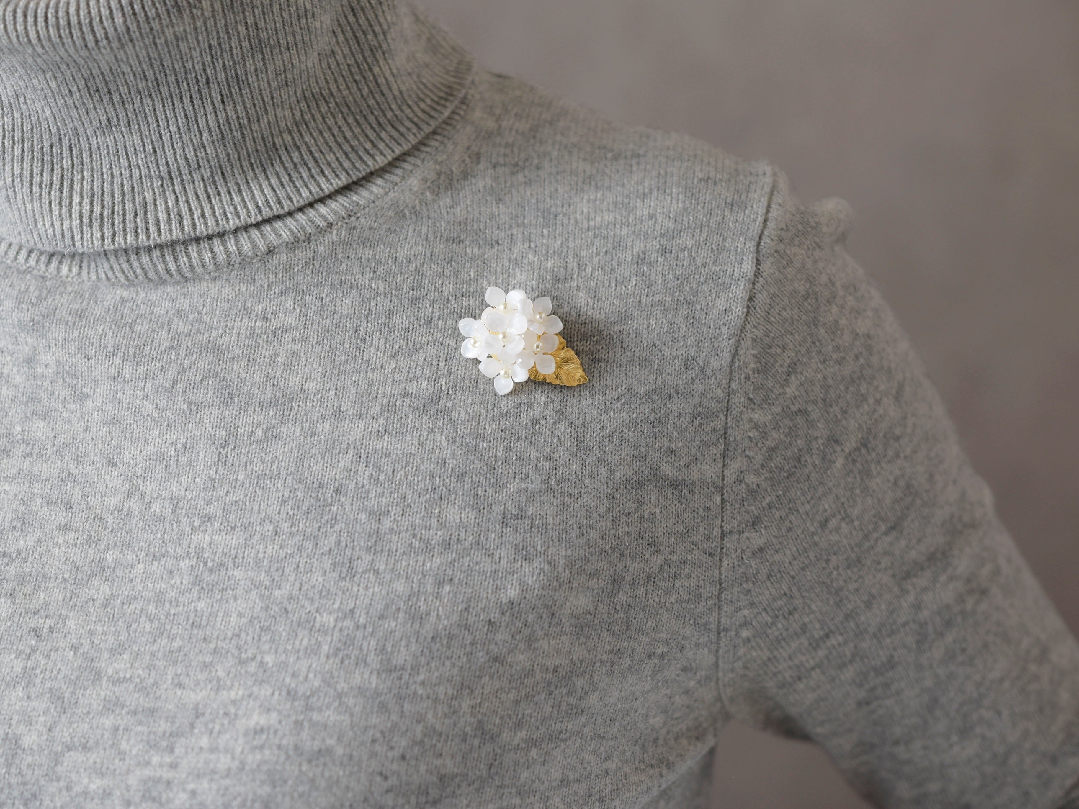 【ブローチ】白色の額紫陽花のお花/真鍮の葉っぱ付(春のフォーマルにも)