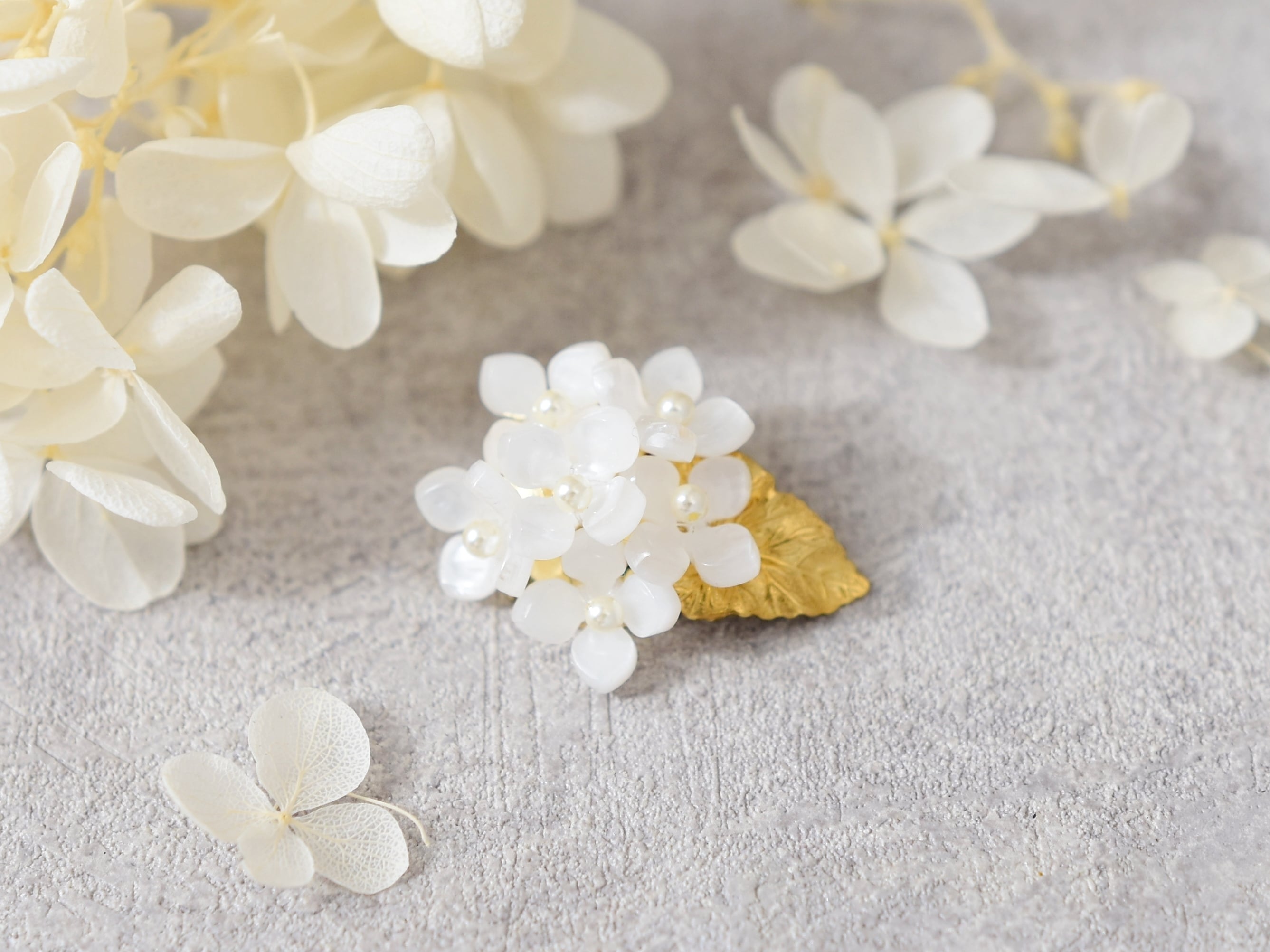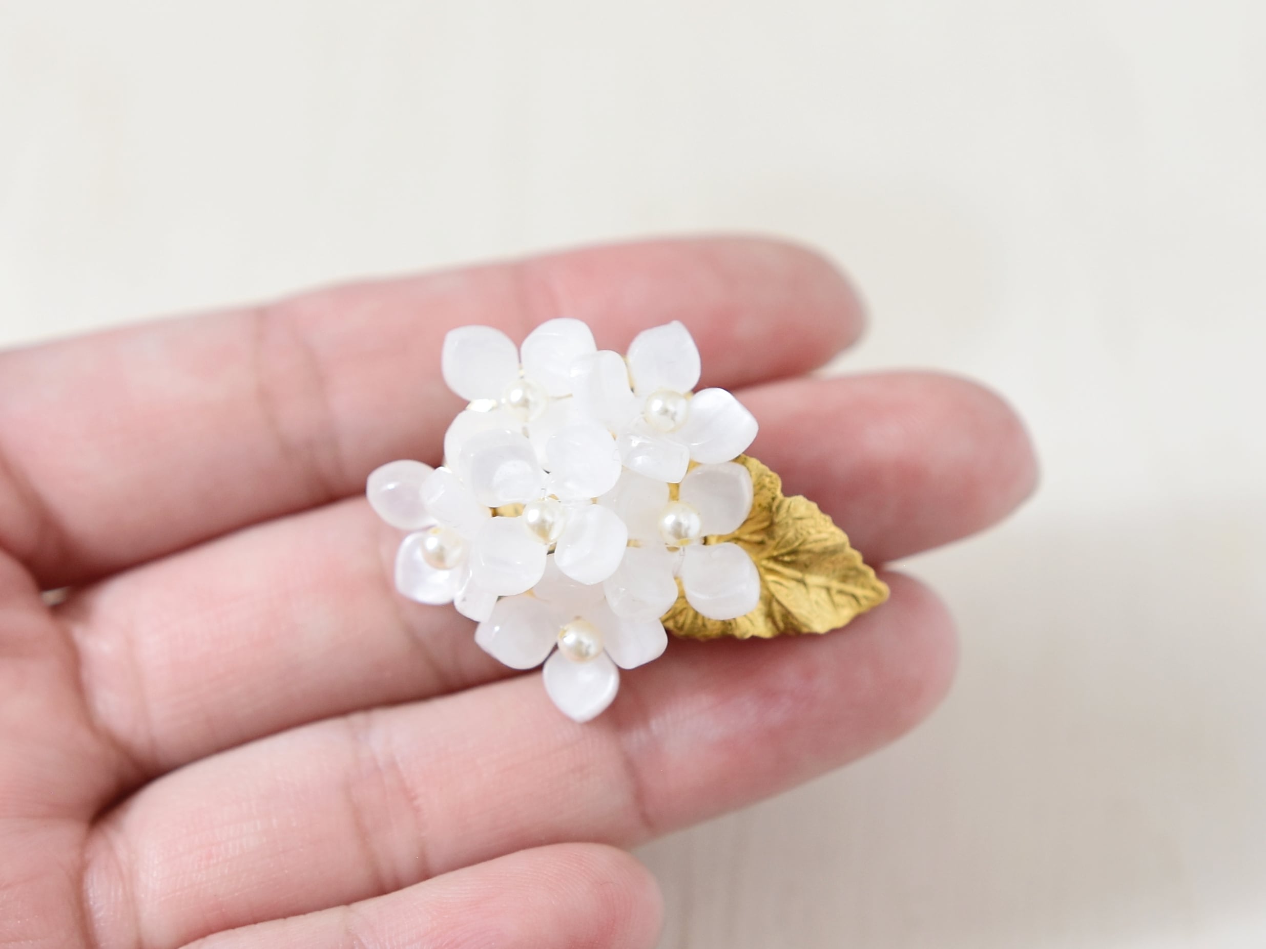 可愛い白色の額紫陽花(ガクアジサイ)のブローチ。