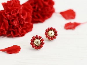 【チタン ピアス/イヤリング】赤珊瑚のアンティークレトロなお花(小/レッド)