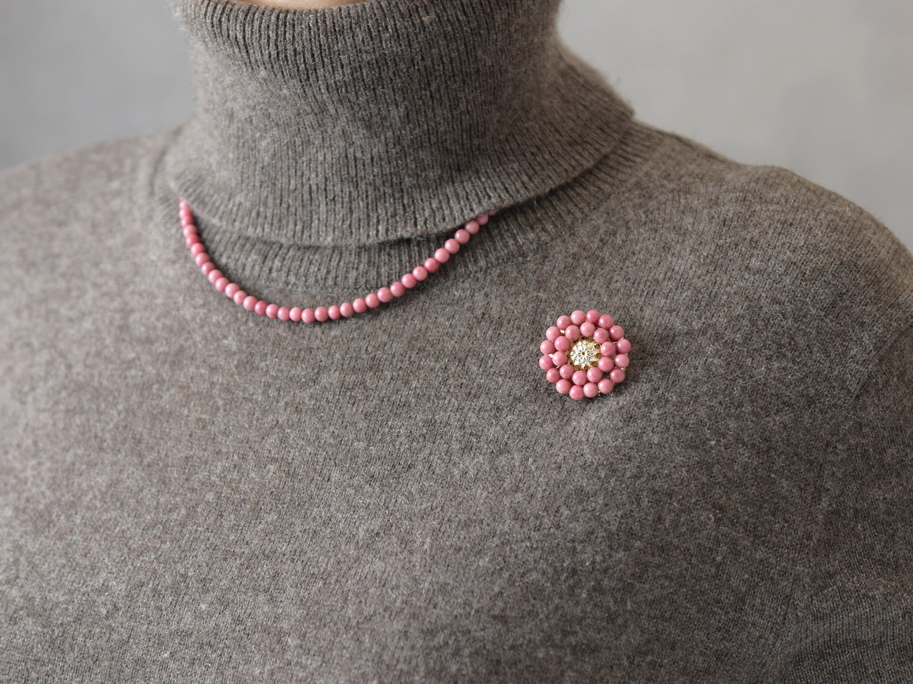 【ブローチ】アンティークレトロなお花/くすみピンク( 天然石・シリシャスシスト)