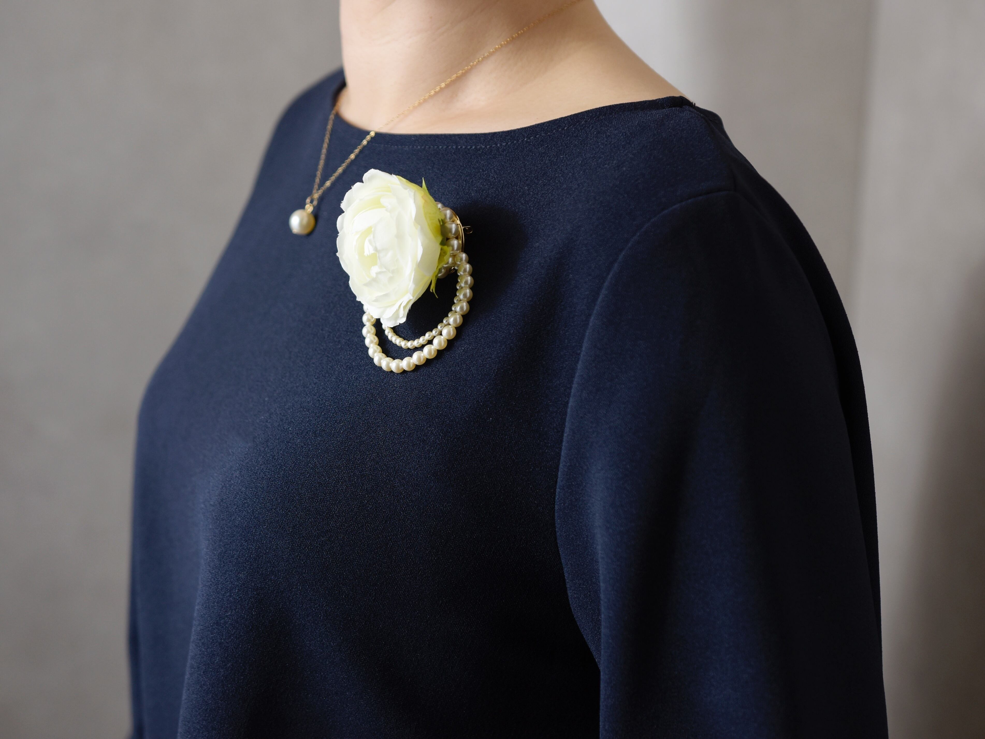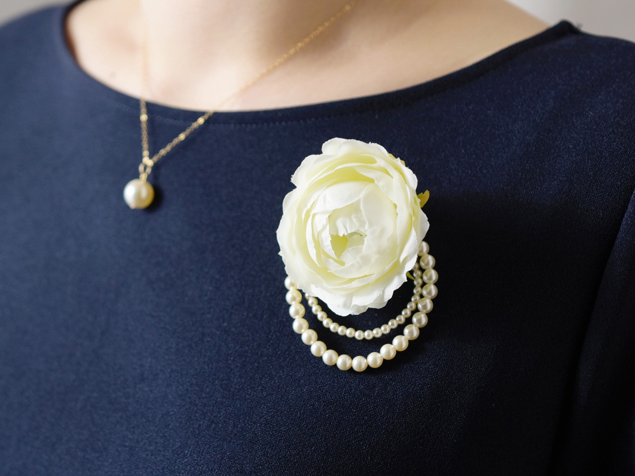 【コサージュ】上品で清楚なバラと2連のパール/白いお花(セットに変更可能)