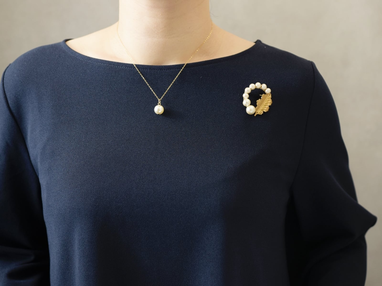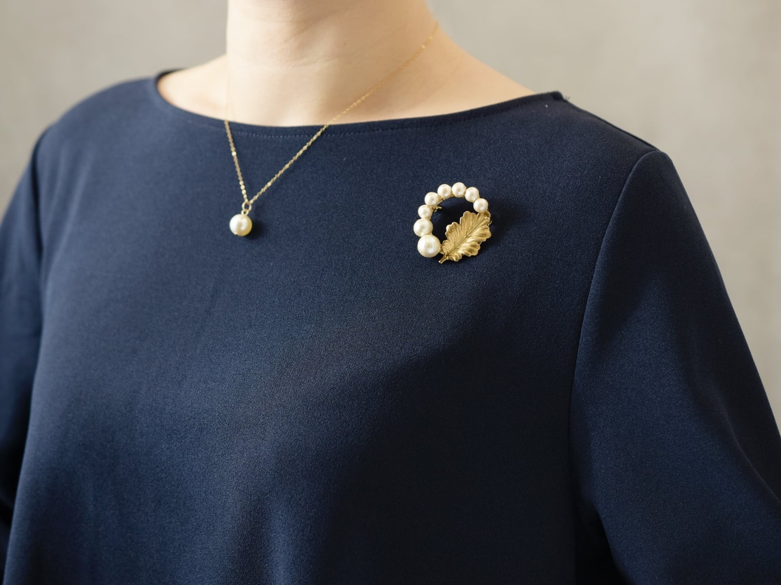 【ブローチ/Sサイズ】ヴィンテージな真鍮の葉っぱとパール(セットに変更可能)