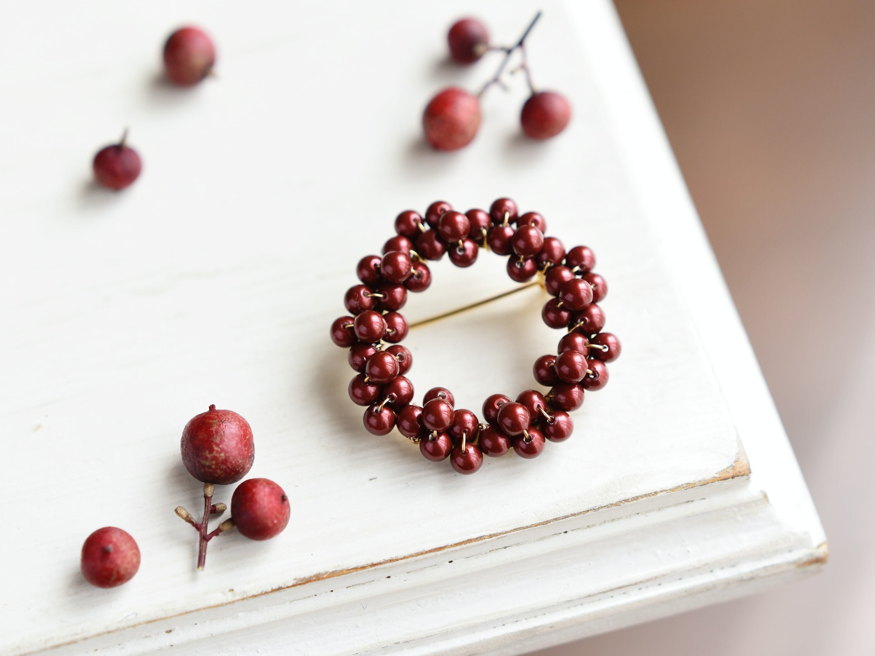まるで赤い木の実をリースに仕立てみたいな大人の赤色ブローチ。