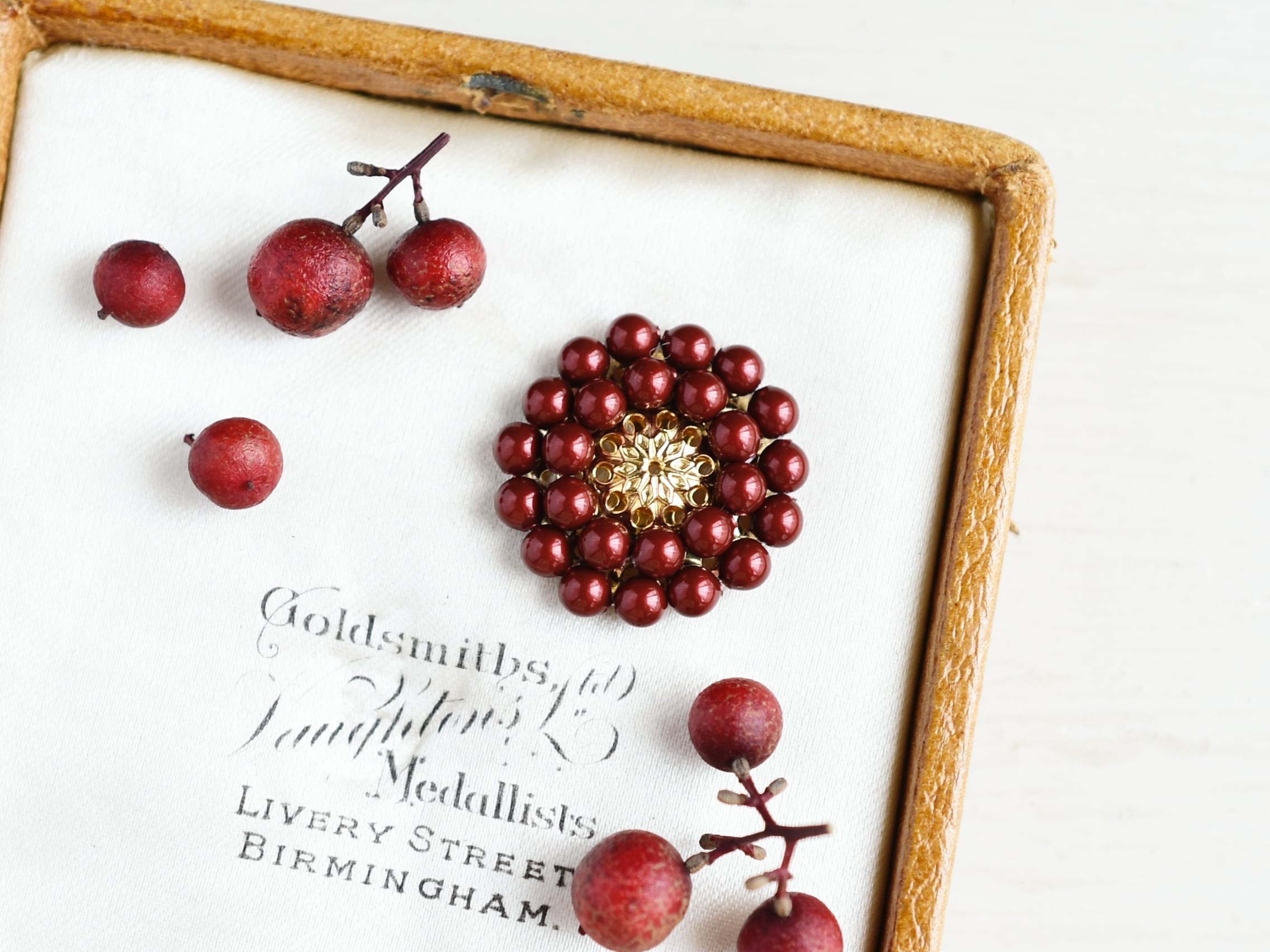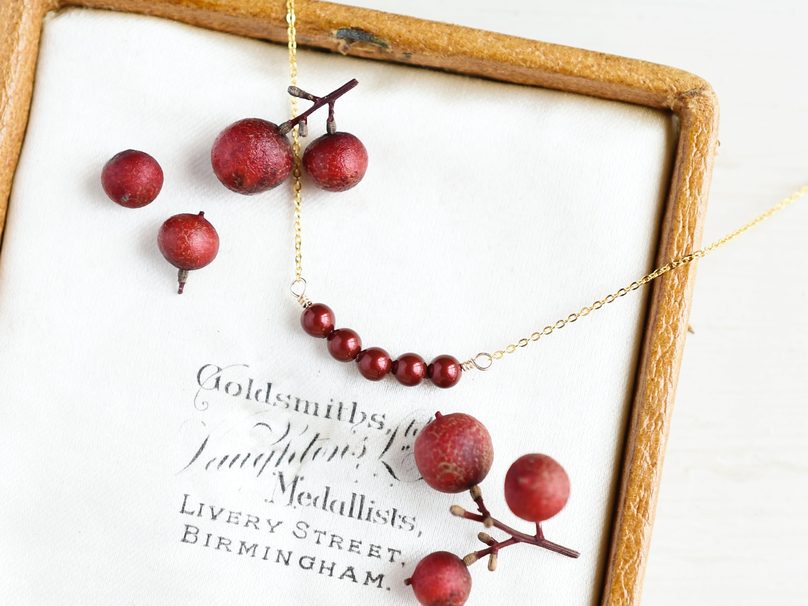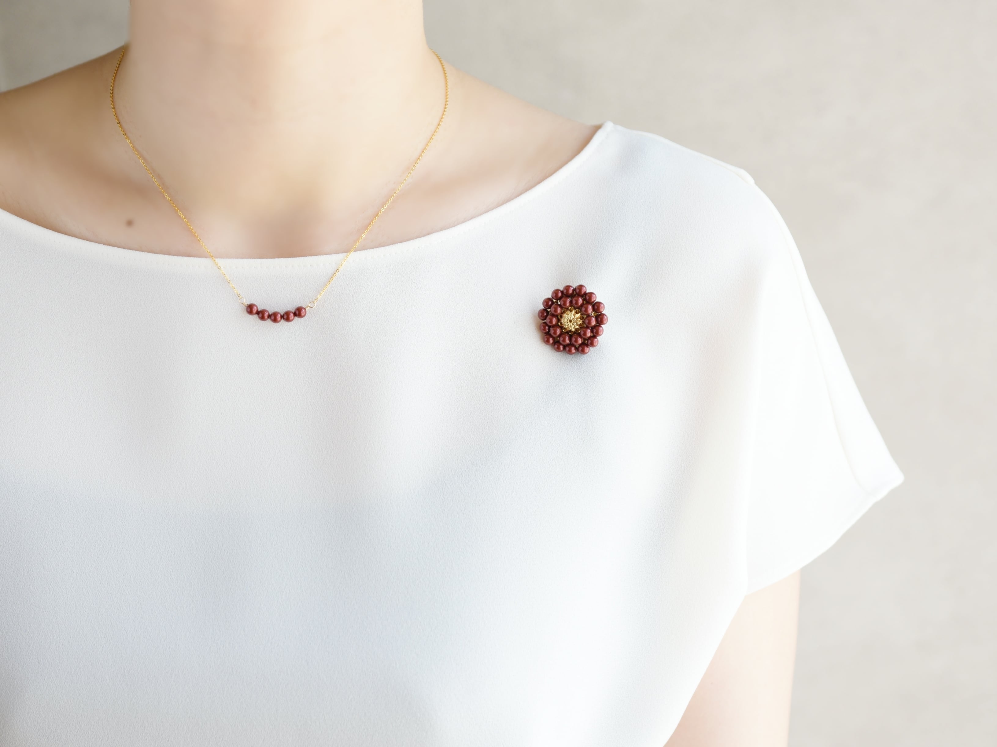ギフトセット【14kgf ネックレスとブローチ】ボルドー・赤い花/還暦祝いにも