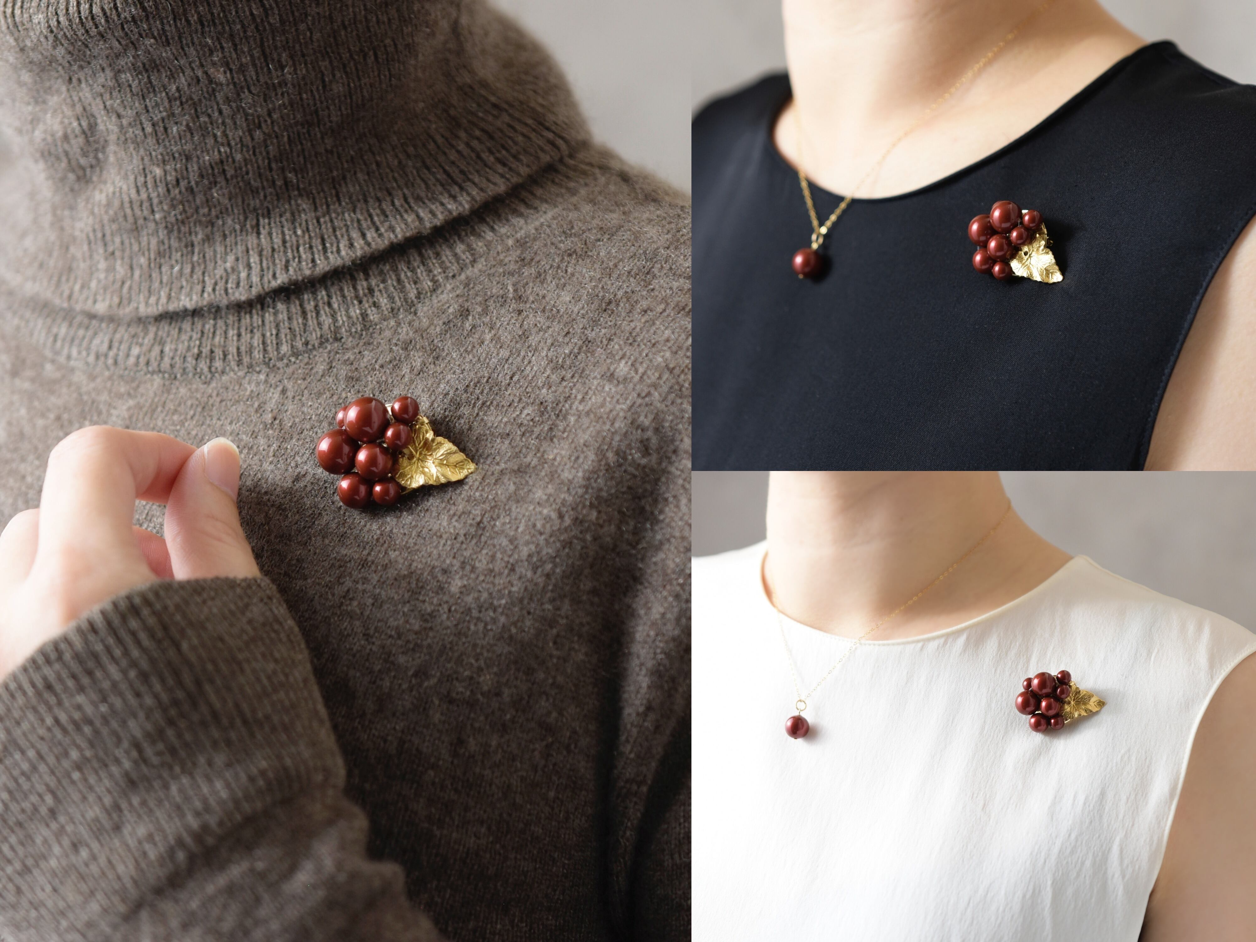 ●ガラスパール(ボルドー色)、ゴールドメッキ、葉っぱ:真鍮