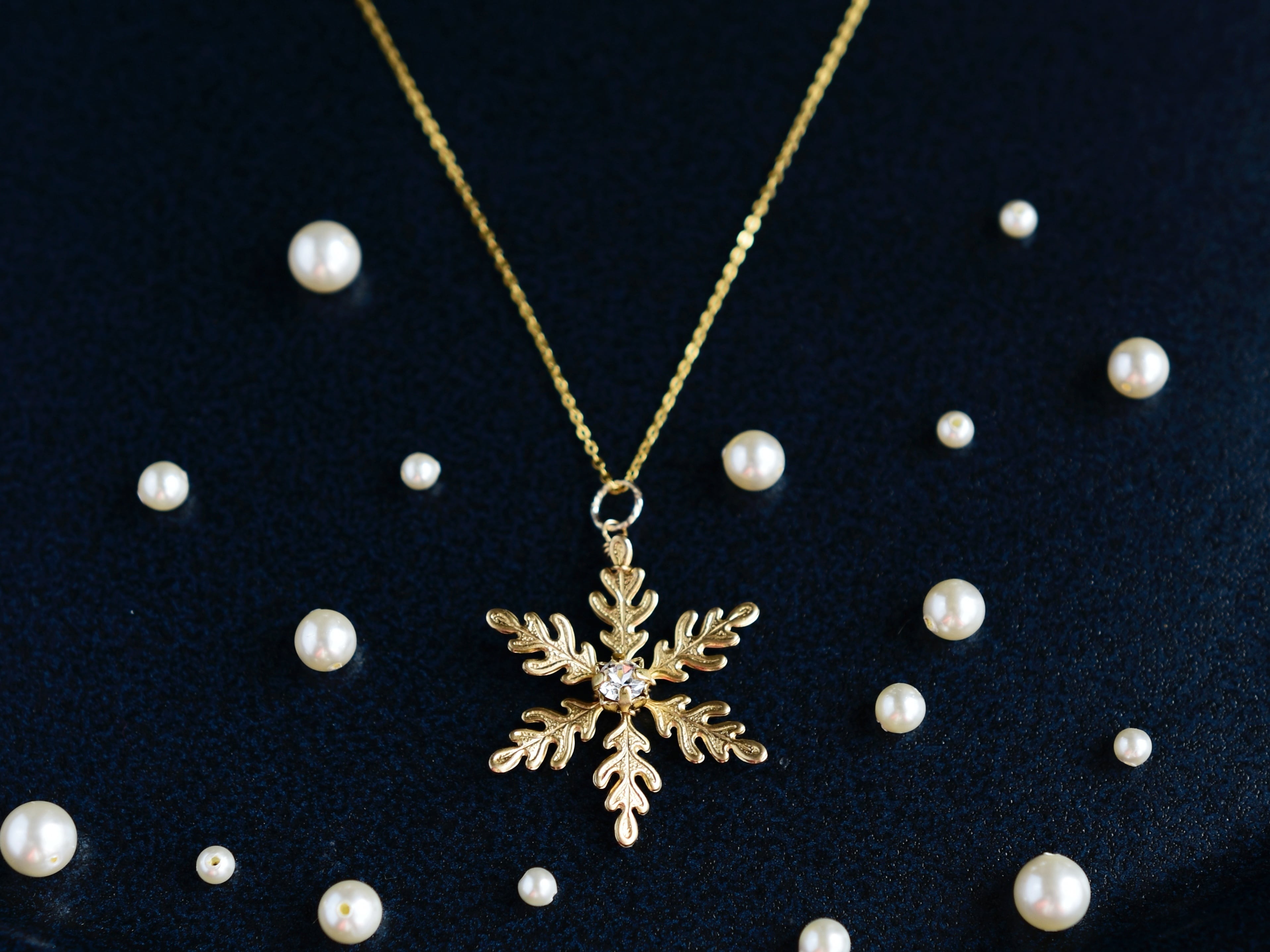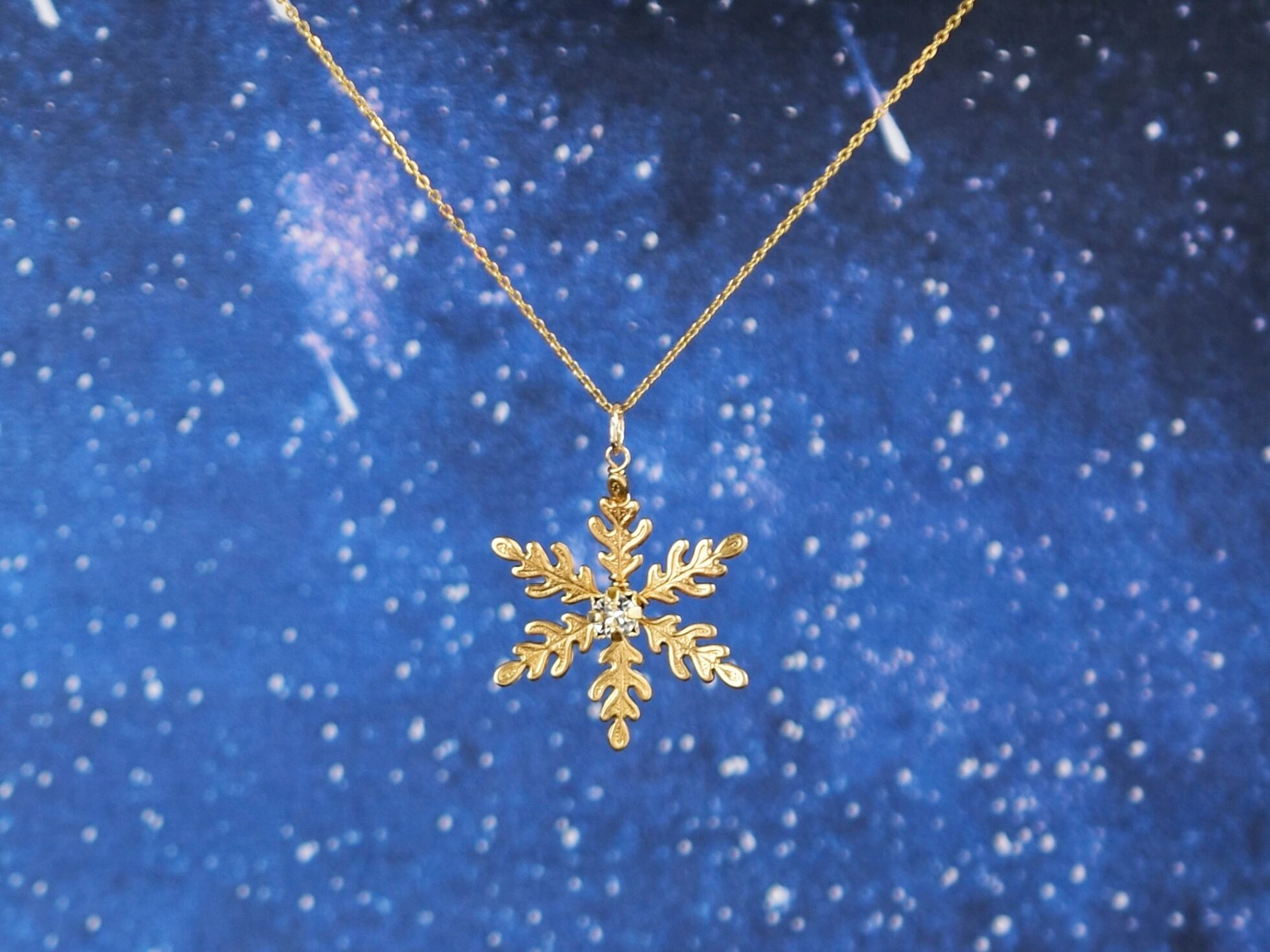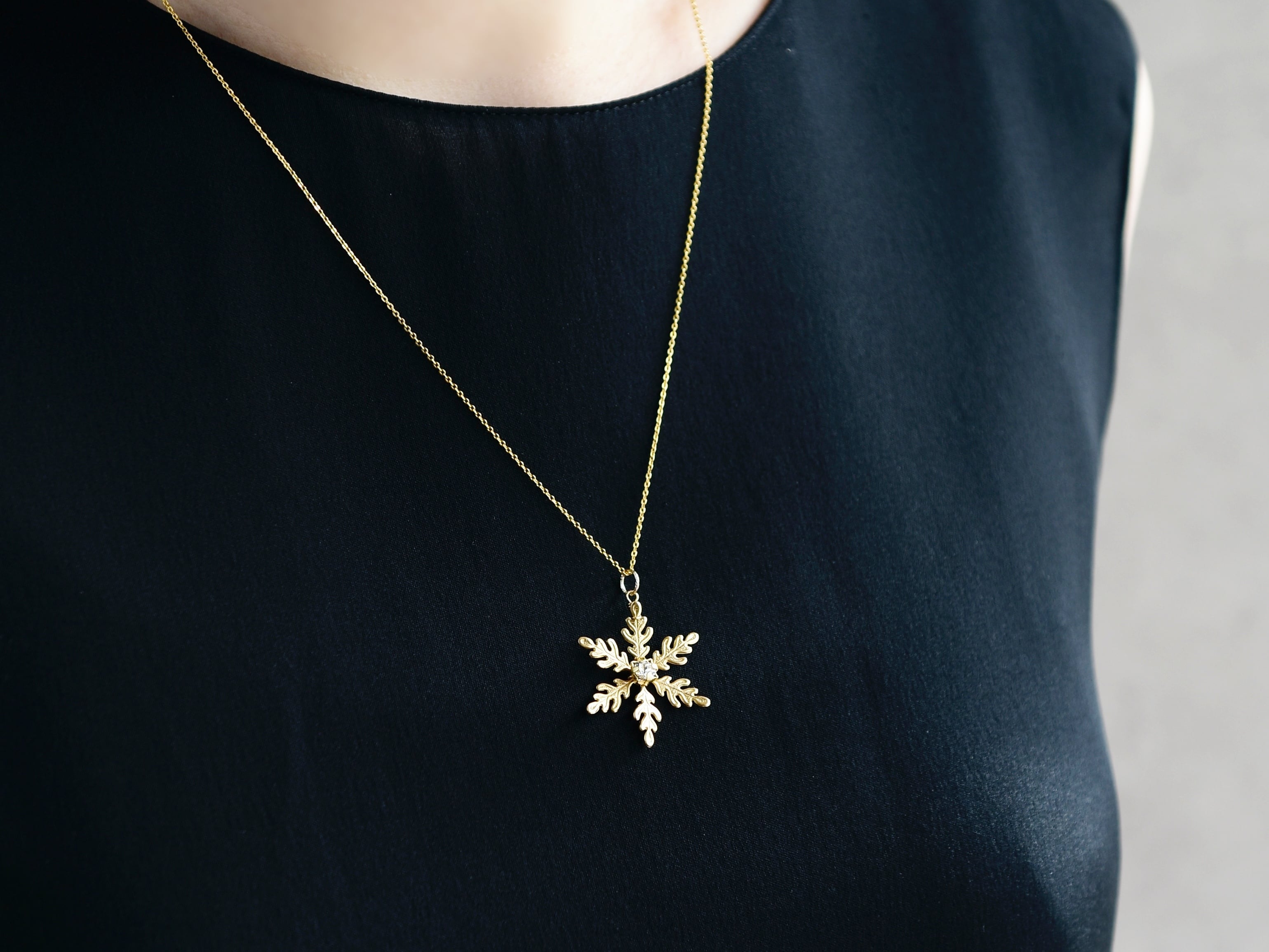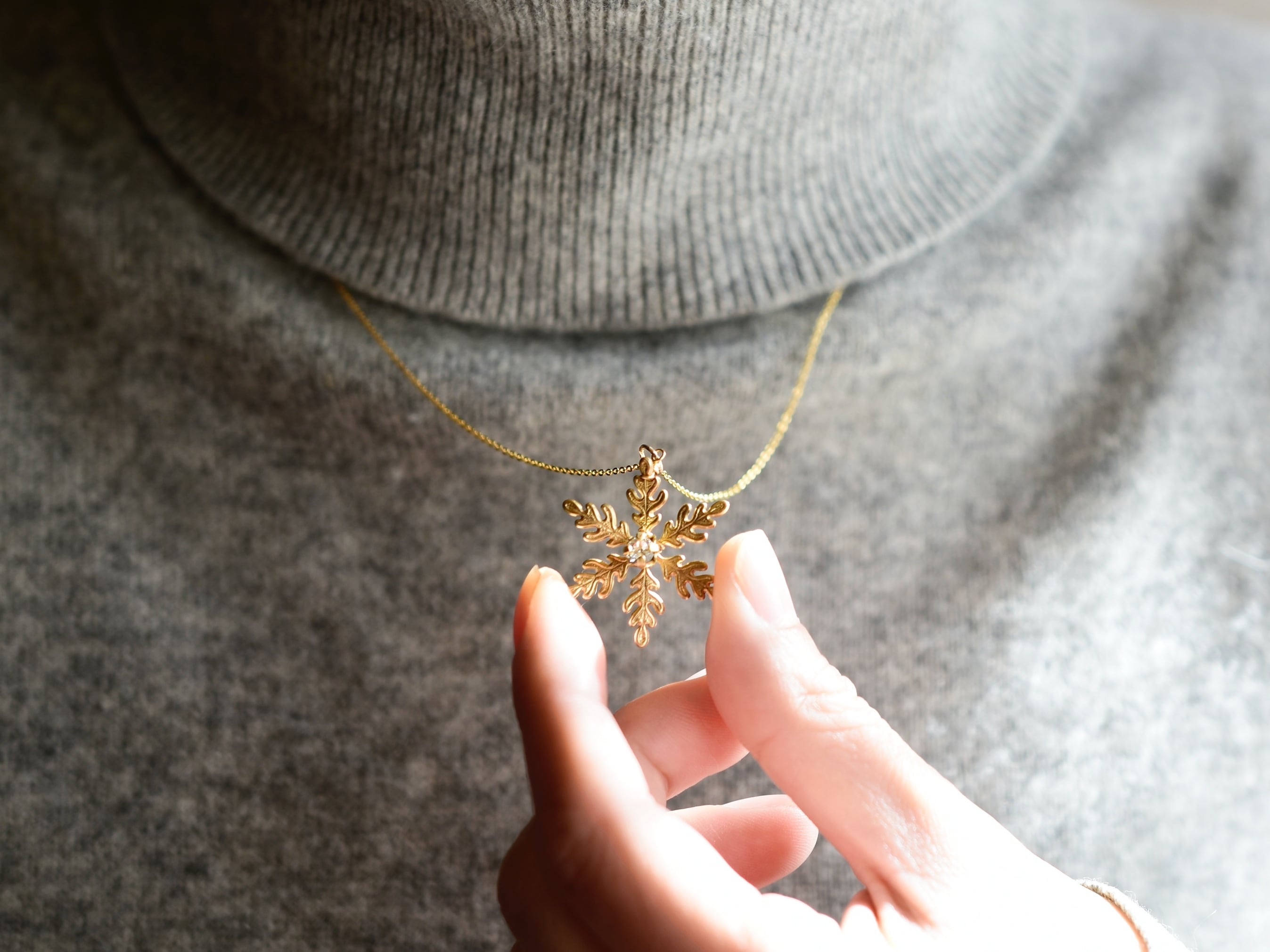期間限定【14kgf ロングネックレス】ヴィンテージな真鍮の雪の結晶とビジュー