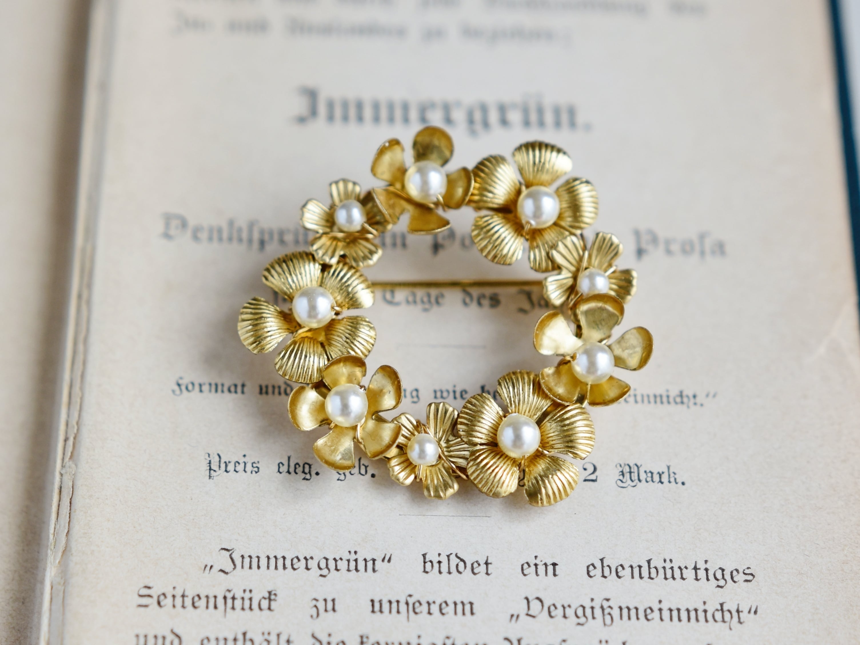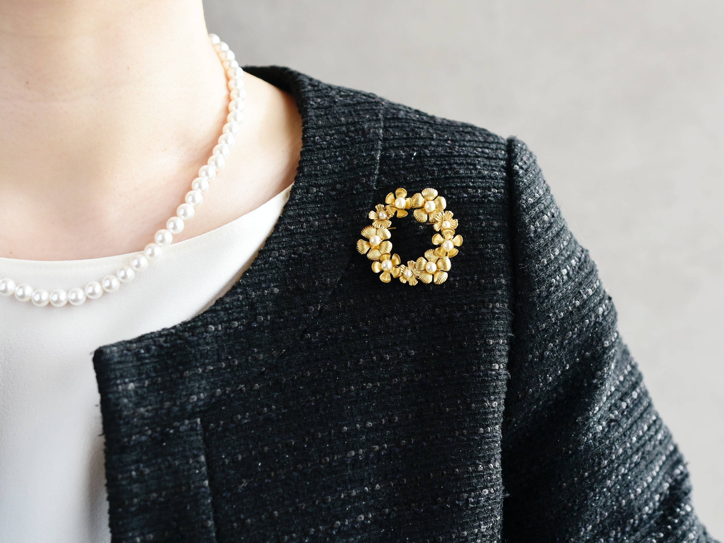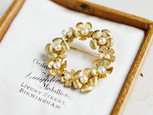【ブローチ/S】ヴィンテージな花冠・真鍮のお花とパール(セットに変更可能)