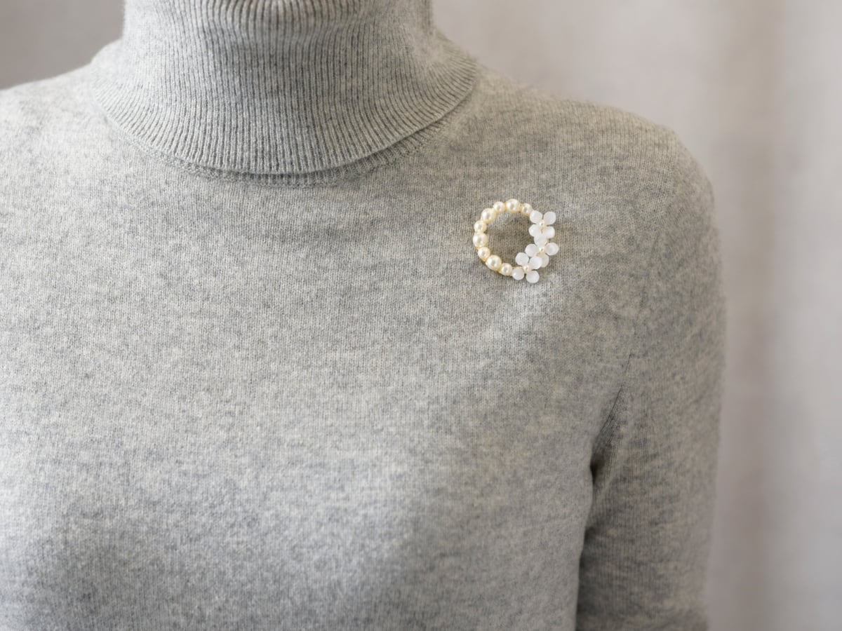 可憐な白い紫陽花のお花が咲いた、上品可愛いパールのブローチ。